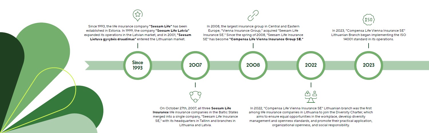 - Prior to 2016, the non-life insurance services in Lithuania were provided by the branch of the Polish insurance company Compensa TU S.A. Vienna Insurance Group, established in 2010. As the company grew and expanded within the Baltic region, structural changes were made, and the Compensa TU S.A. Vienna Insurance Group Lithuanian Branch transferred its entire business, including assets, rights, and obligations, to the newly established joint-stock insurance company ADB Compensa Vienna Insurance Group.